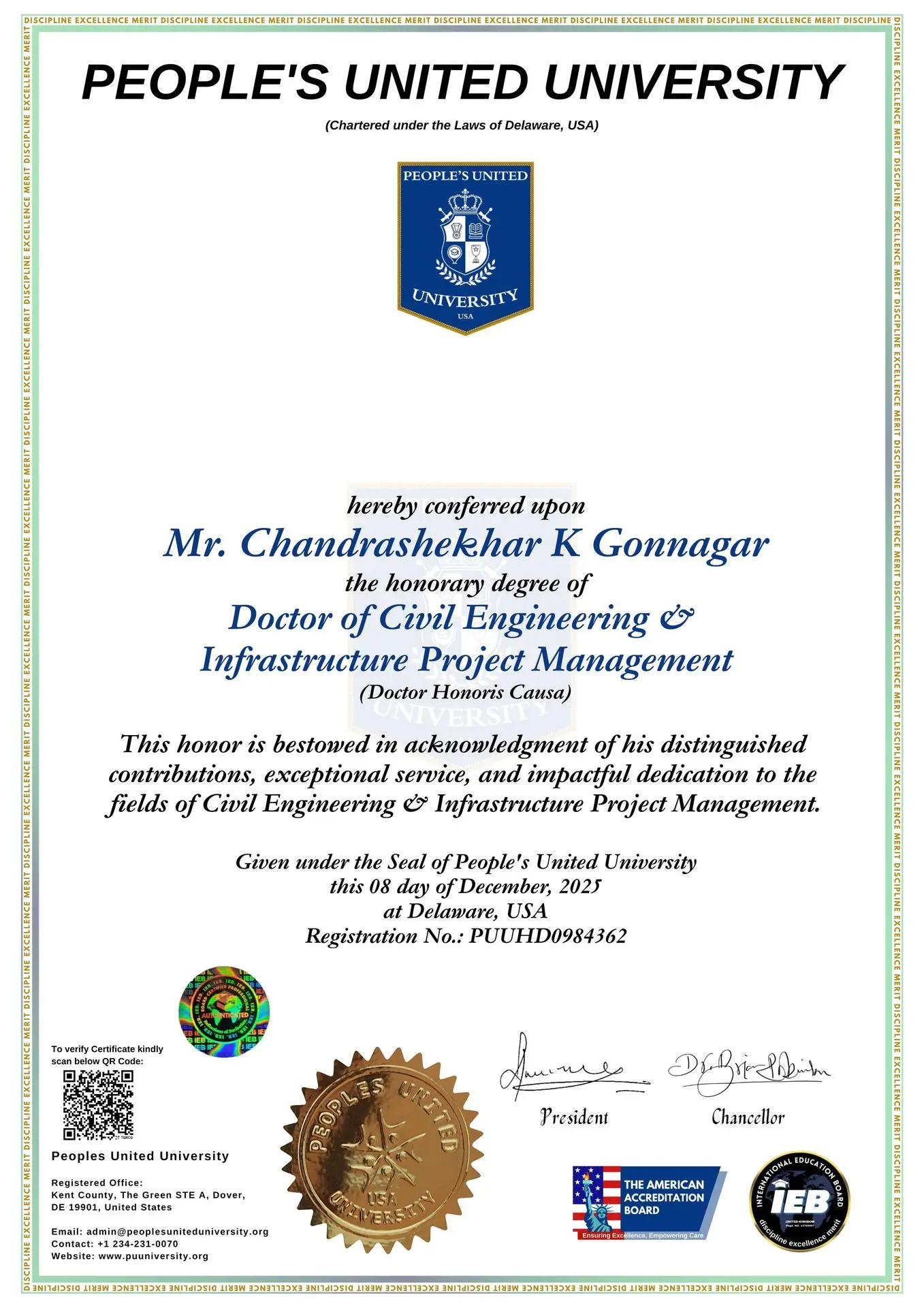 Honorary Doctor of Philosophy (PhD) in Civil Engineering & Infrastructure Project Management (Doctor Honoris Causa)